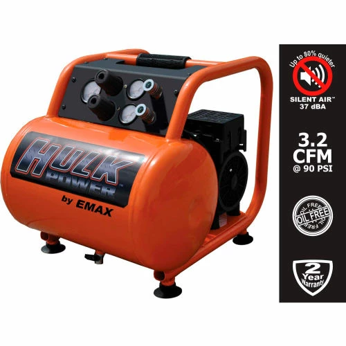 Hulk by EMAX silent air compressors are designed to provide all power with little noise! The oil free, dual piston 2 cylinder pump with low amp draw and solid copper winding’s allows for less wear and tear. These commercial grade pumps are designed with heavy gauge steel cylinders, cylinder head and valves for maximum durability and reliability. Providing 5.29 CFM @ 40 PSI & 3.24 @ 90 PSI and an amazing 37 DB @ 3 FT away!